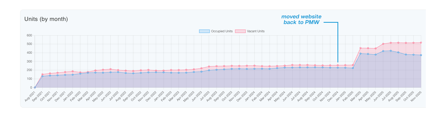 This San Antonio property management company originally partnered with PMW but moved to a non-PMW solution in 2020. Although operationally sound, the company’s growth stagnated at just 2.5 units per month over 42 months after moving to a non-PMW website, limited by poor site conversion and weak inbound lead generation.