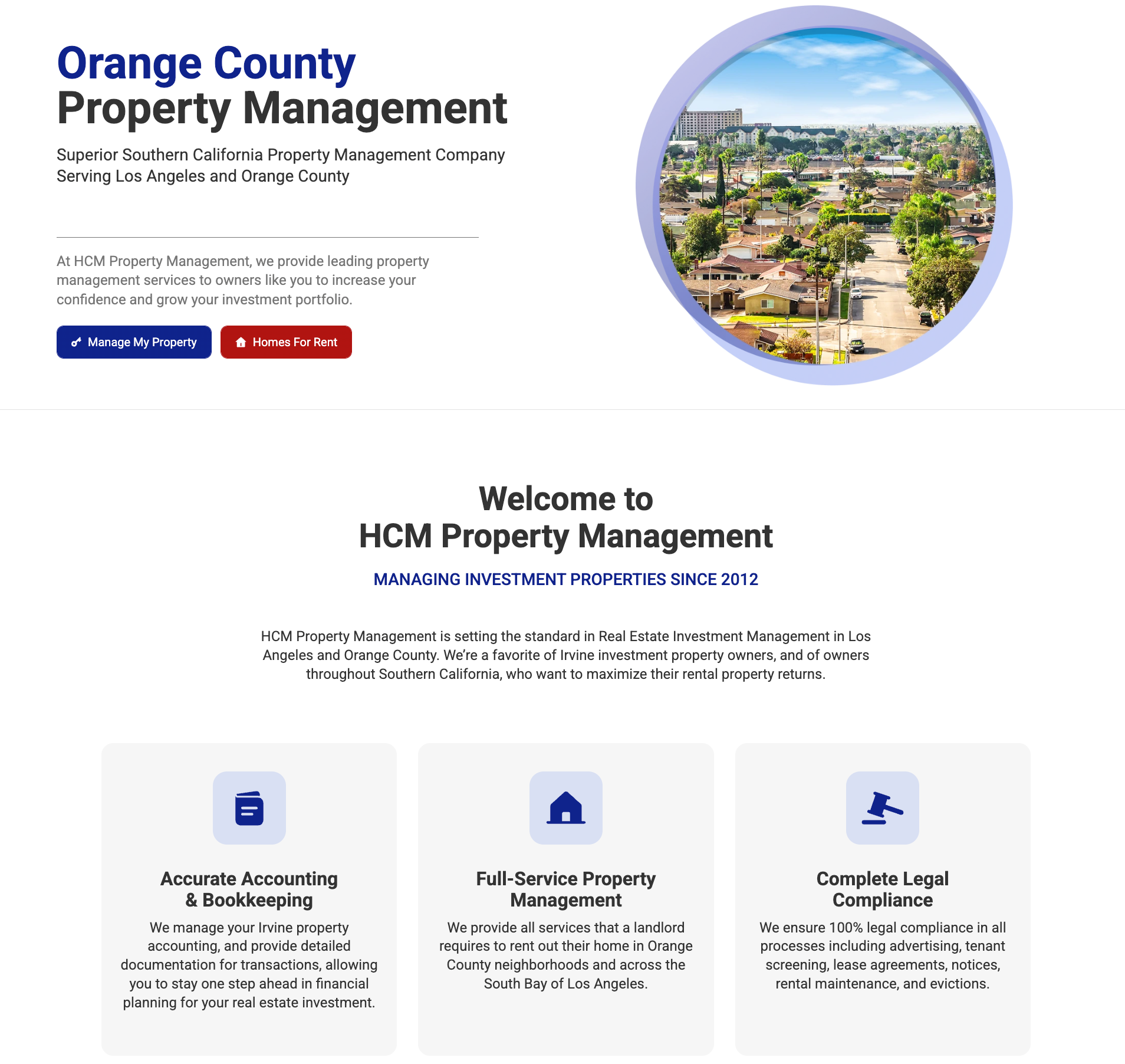When it comes to property management in Southern California, professionalism and clarity are key — and HCM Property Management’s new website captures both beautifully. Designed to reflect their established reputation and straightforward approach to property management, this newly launched site brings a fresh, corporate feel to the Los Angeles and Orange County markets while maintaining accessibility for property owners and tenants alike.